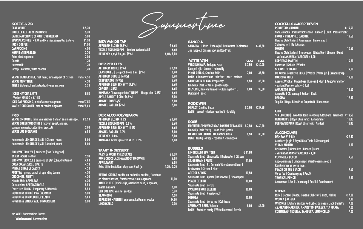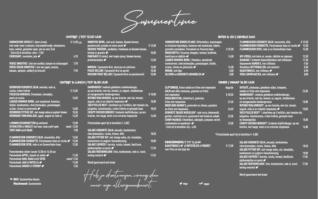 De menukaart van SummerTime is zoals je ‘m mag verwachten op het strand: Goed eten, waar je niet te lang op hoeft te wachten, bereid met verse producten en waarbij we zoveel mogelijk ons best doen de kaart steeds duurzamer te maken. Je vindt dat terug in de grote verscheidenheid aan vegetarische en veganistische gerechten.